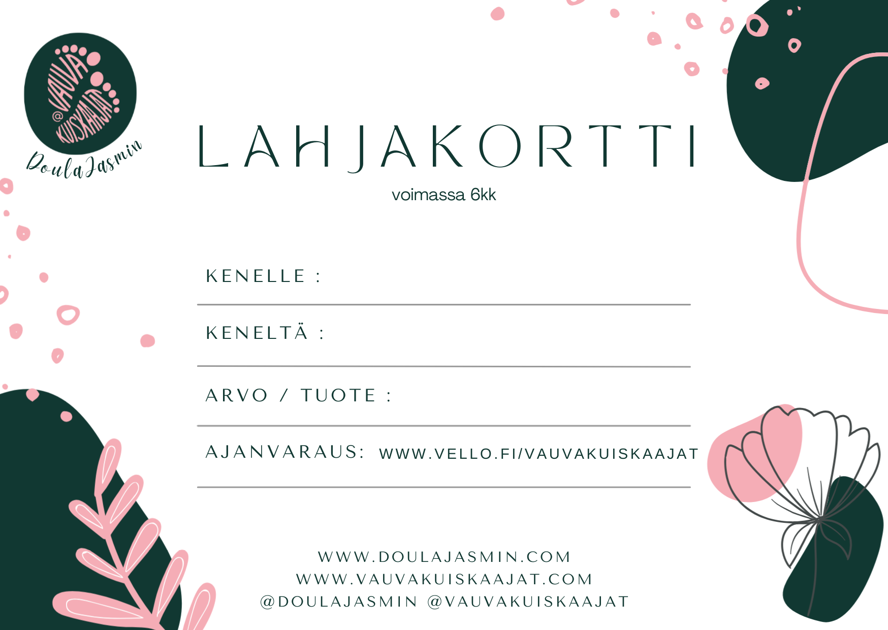 Lahjakortin ostat laittamalla viestiä, sähköpostia doulajasmin.partanen@gmail.com tai suoraan Vellon kautta.